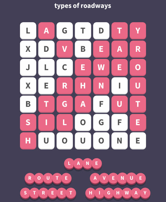 WordWhizzle Search Puzzle Answers for February 5, 2018 is based on Clue “types of roadways”. Let’s put them all together using the key to WordWhizzle Search for today:
