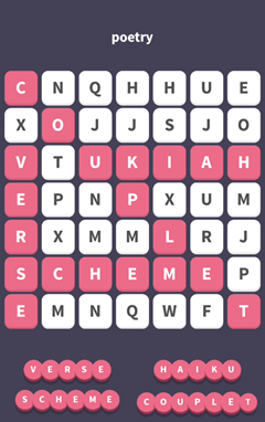WordWhizzle Search Puzzle Answers for November 10, 2016 is based on Clue “poetry”. Let’s put them all together using the key to WordWhizzle Search for today: